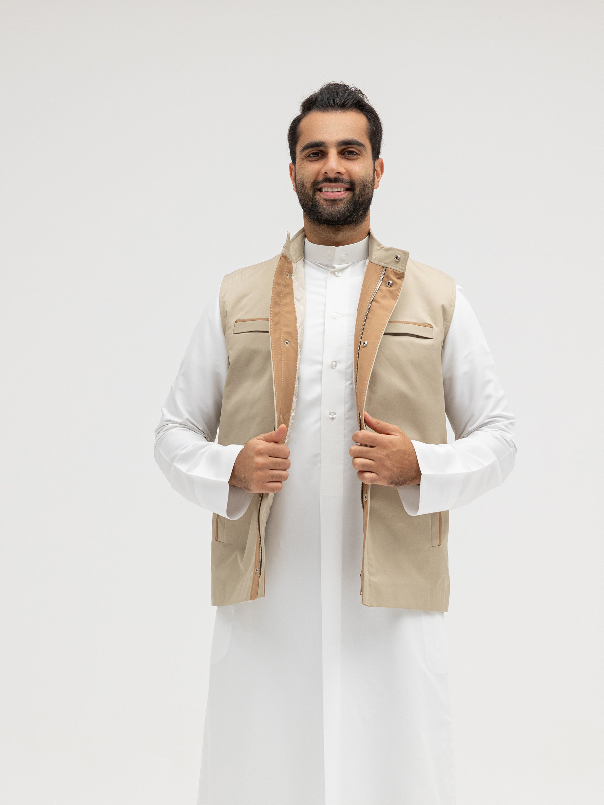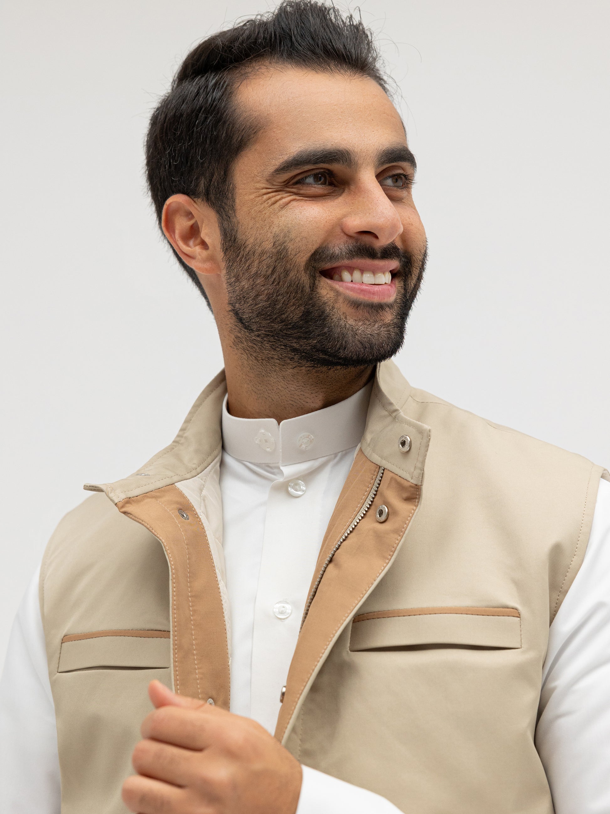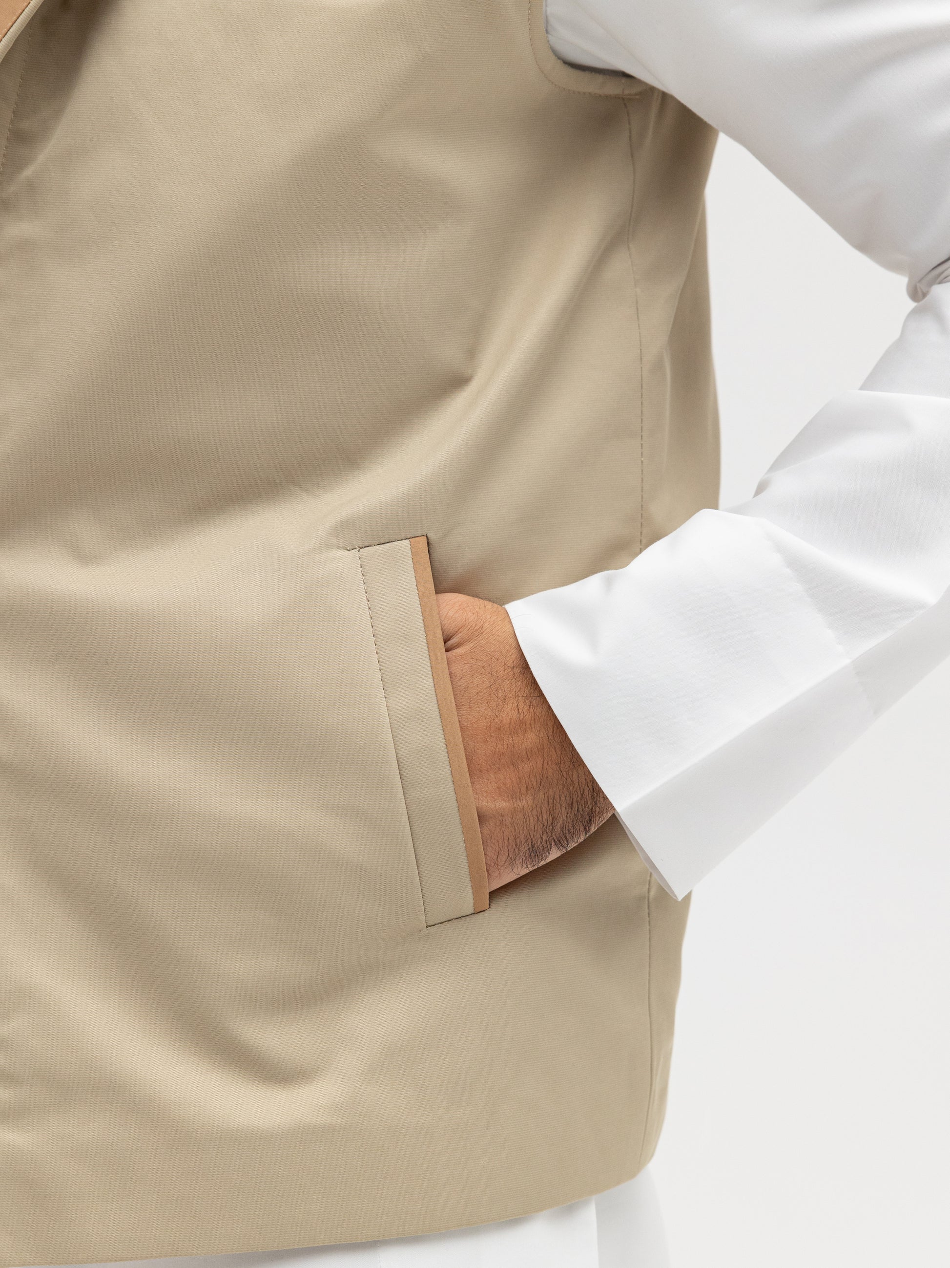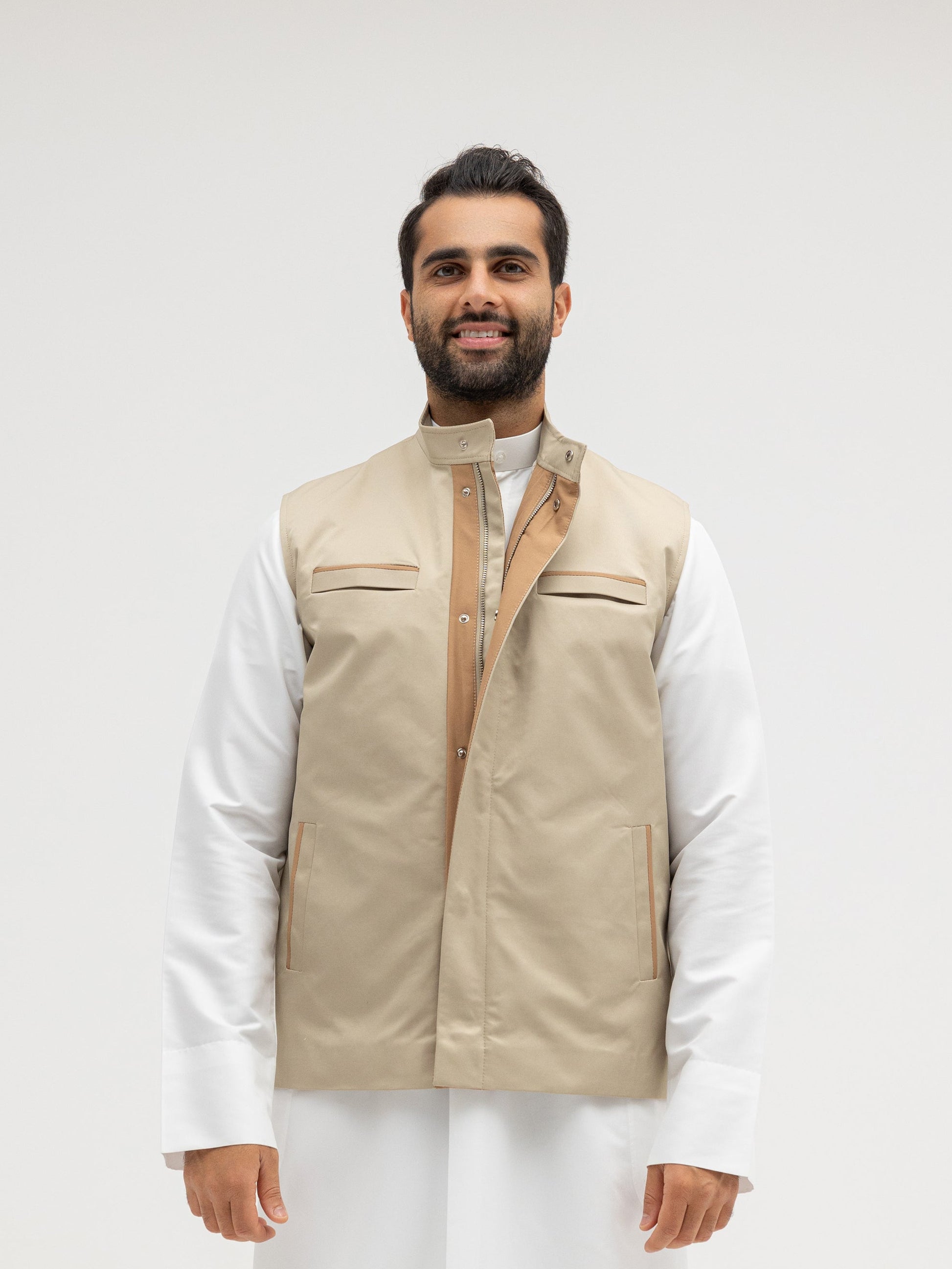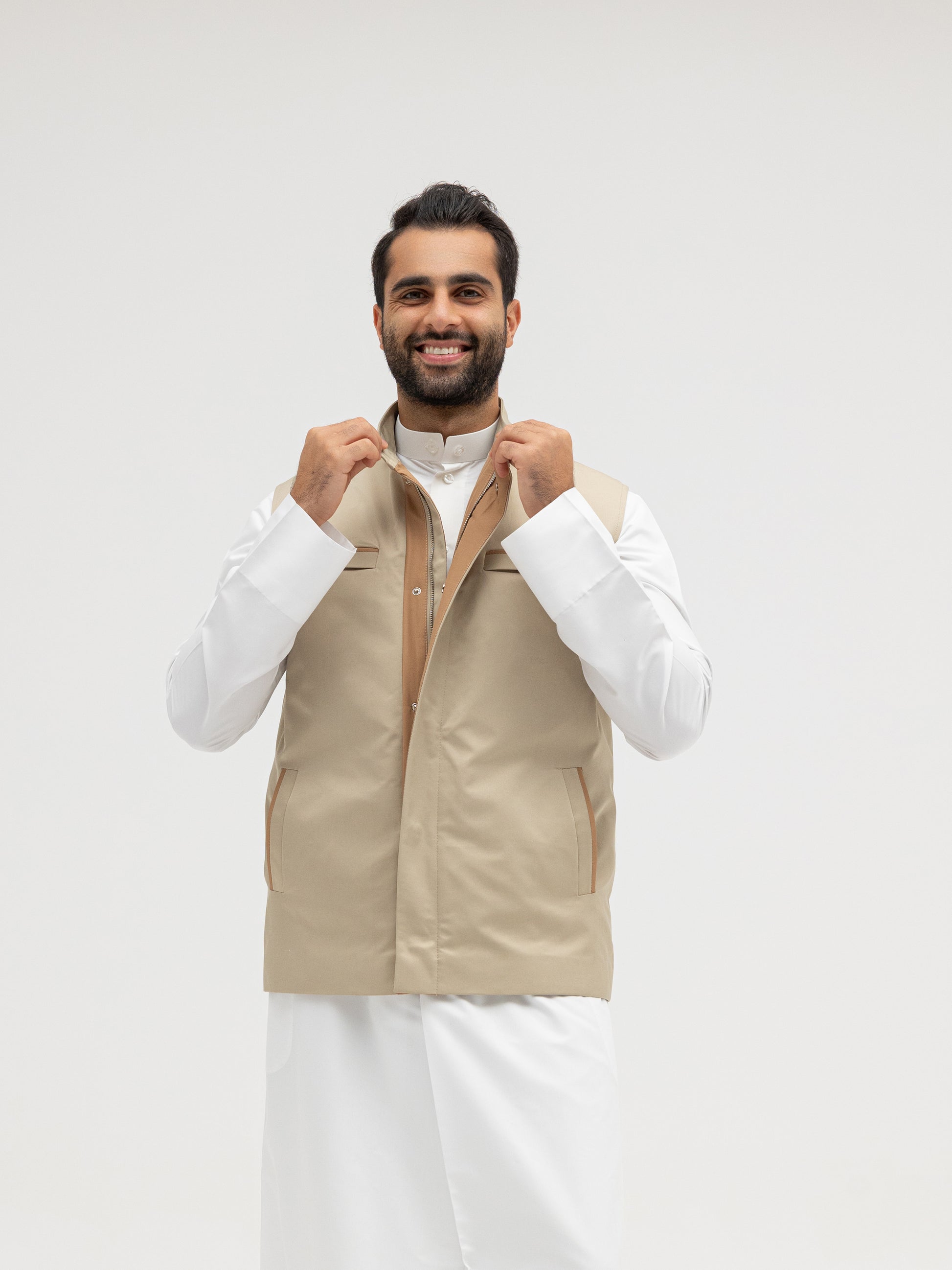 A soft beige vest accented with camel tones that add depth and warmth to the design. Designed for effortless layering, offering comfort and sophistication in every detail.