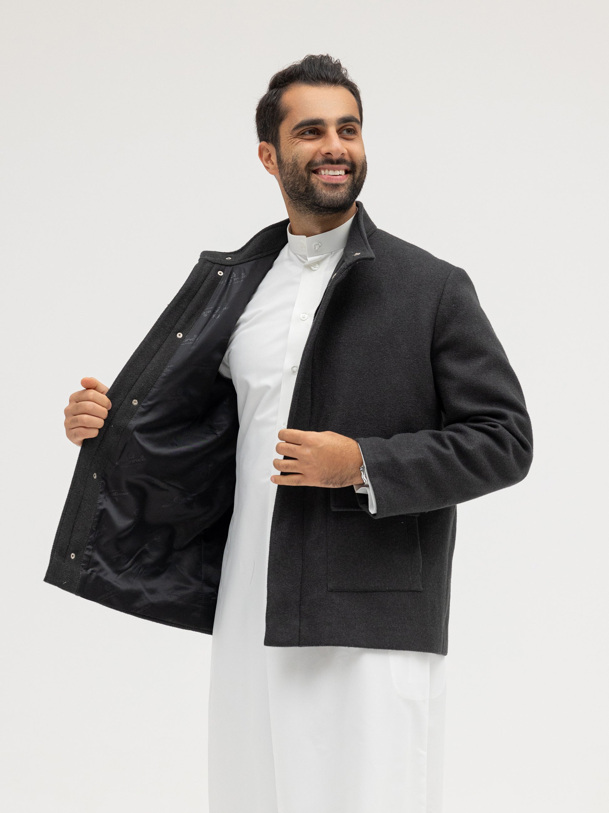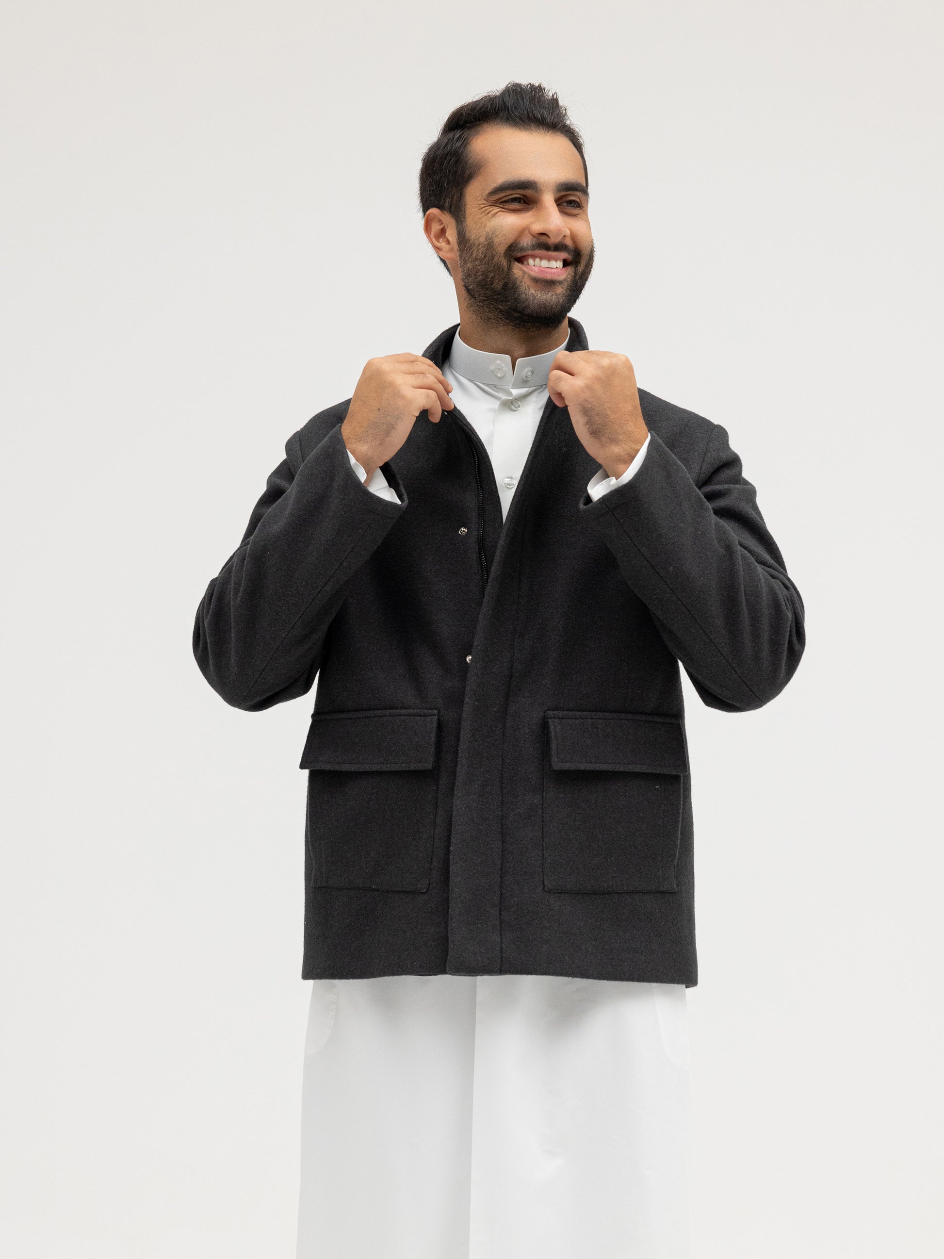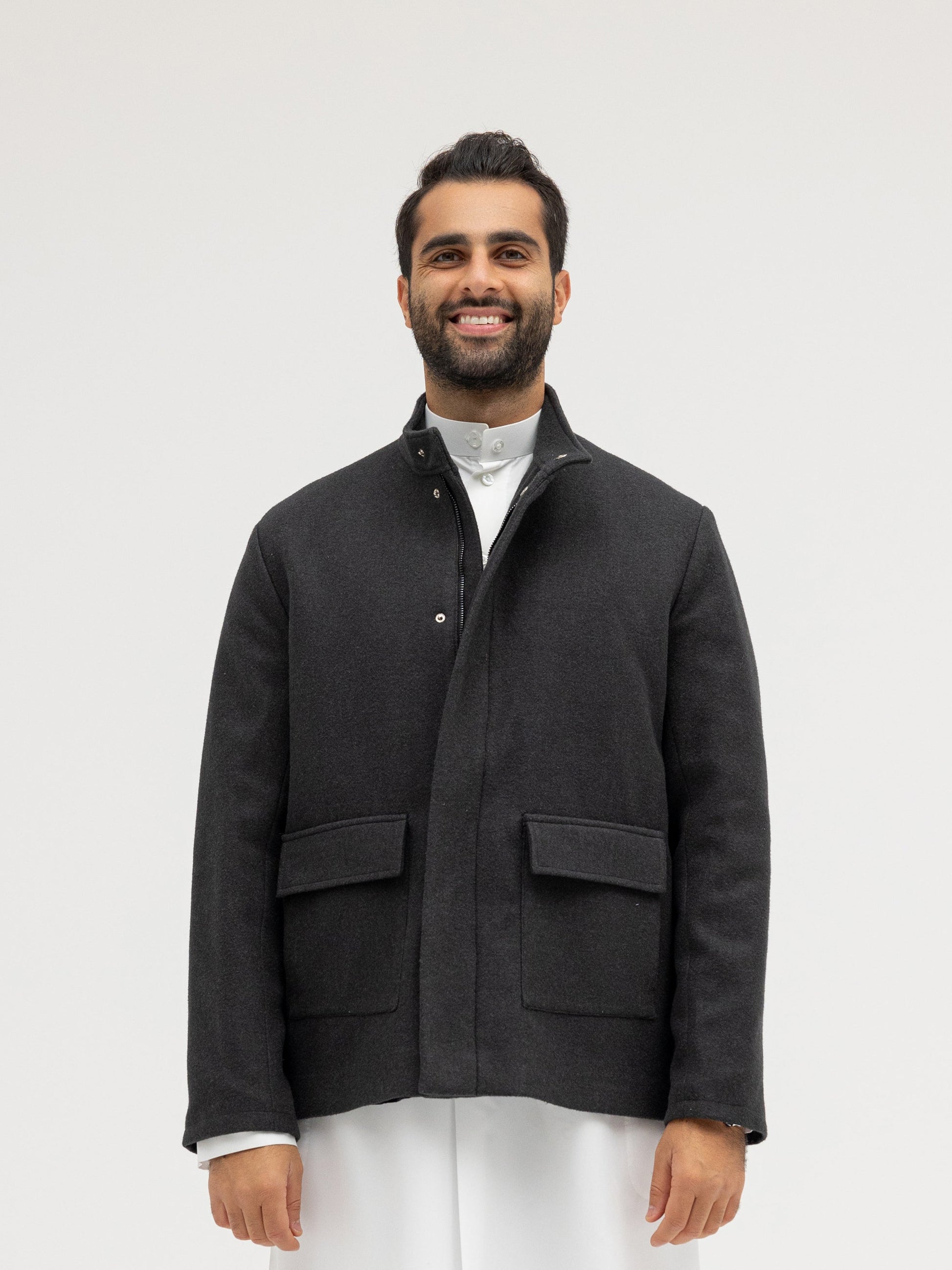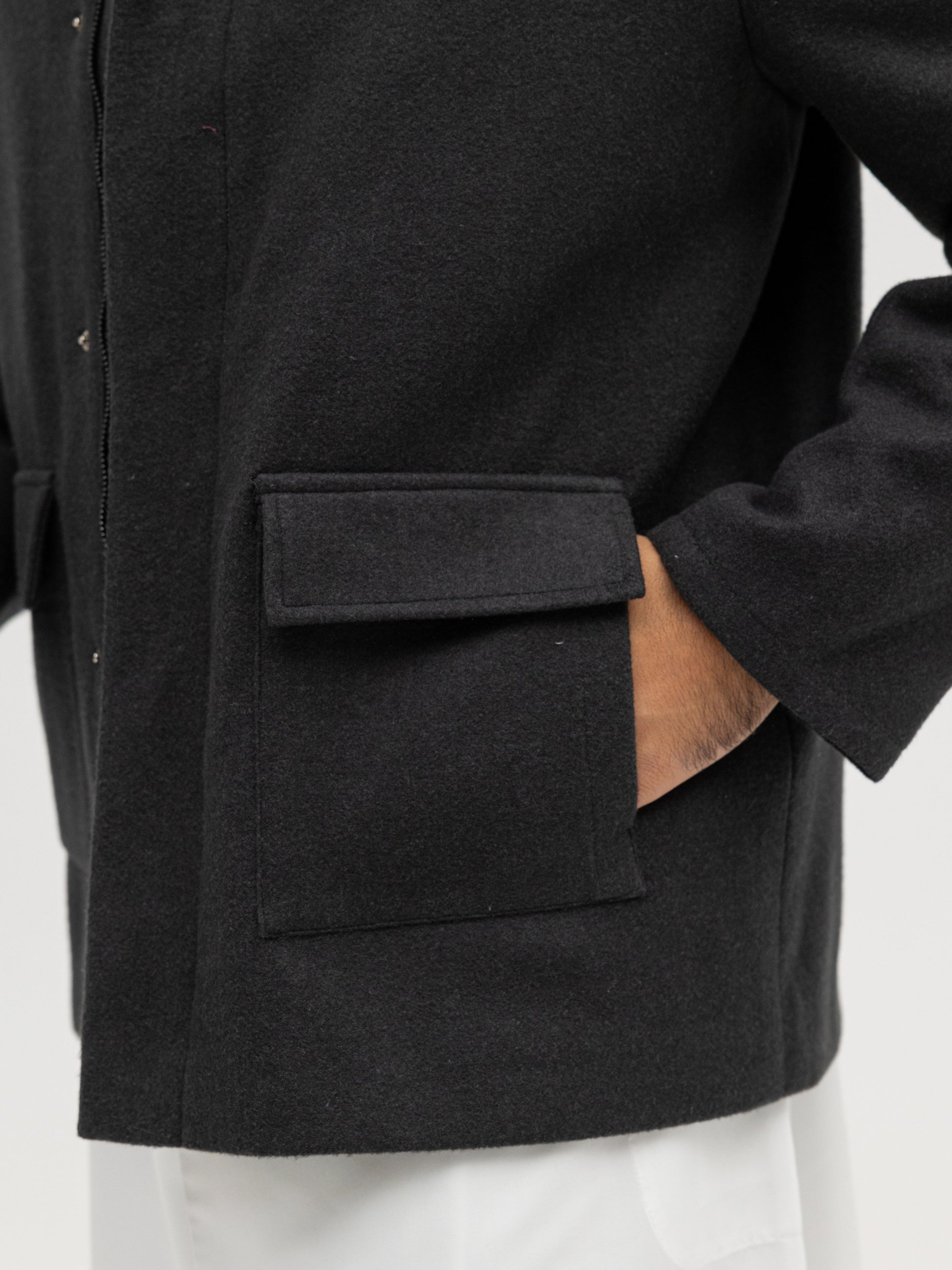 A classic black jacket crafted from premium wool fabric for warmth and comfort. Designed with a structured fit, front flap pockets, and a clean minimal finish — perfect for refined winter looks.