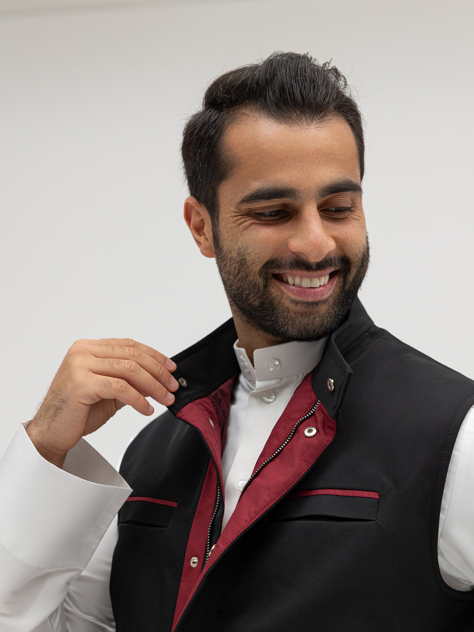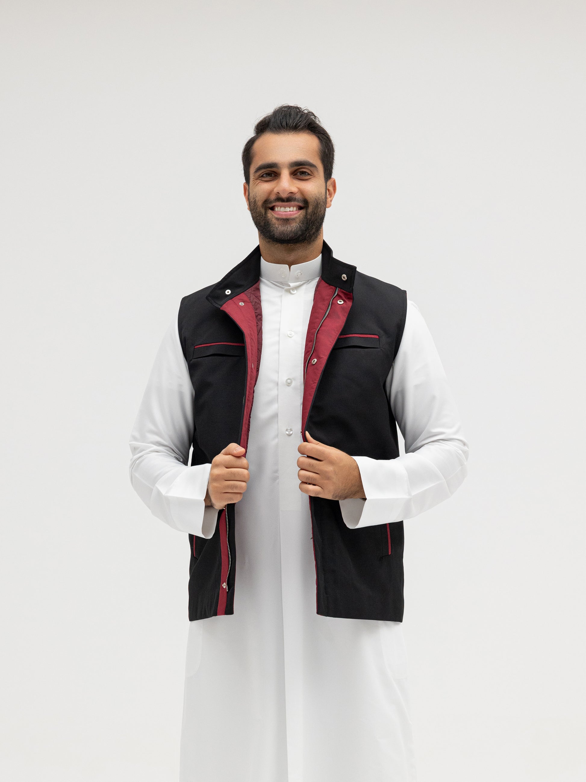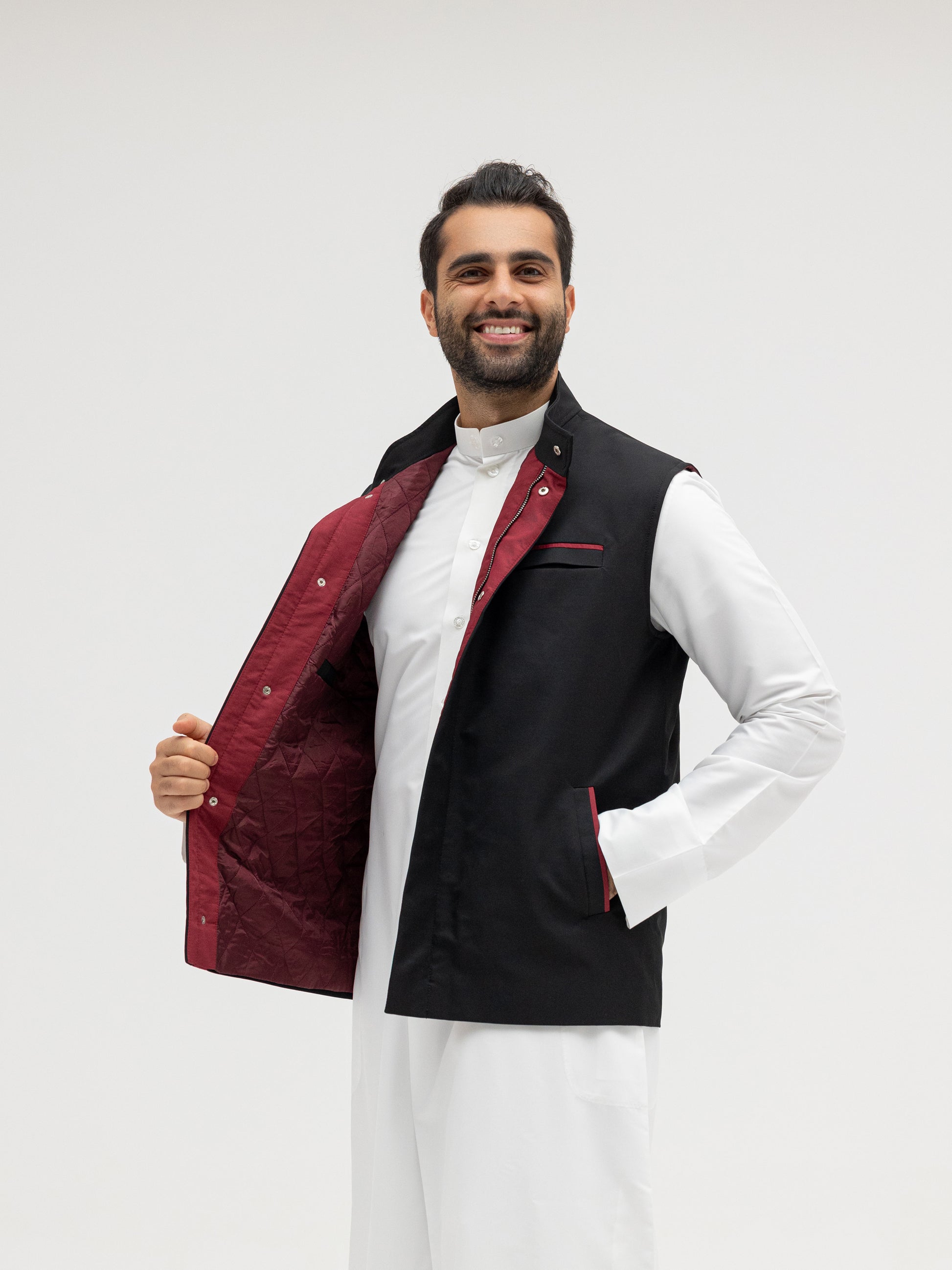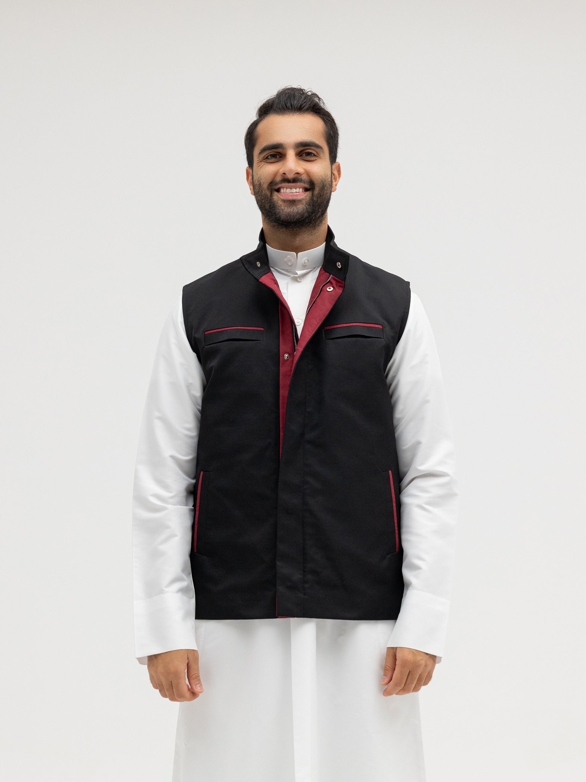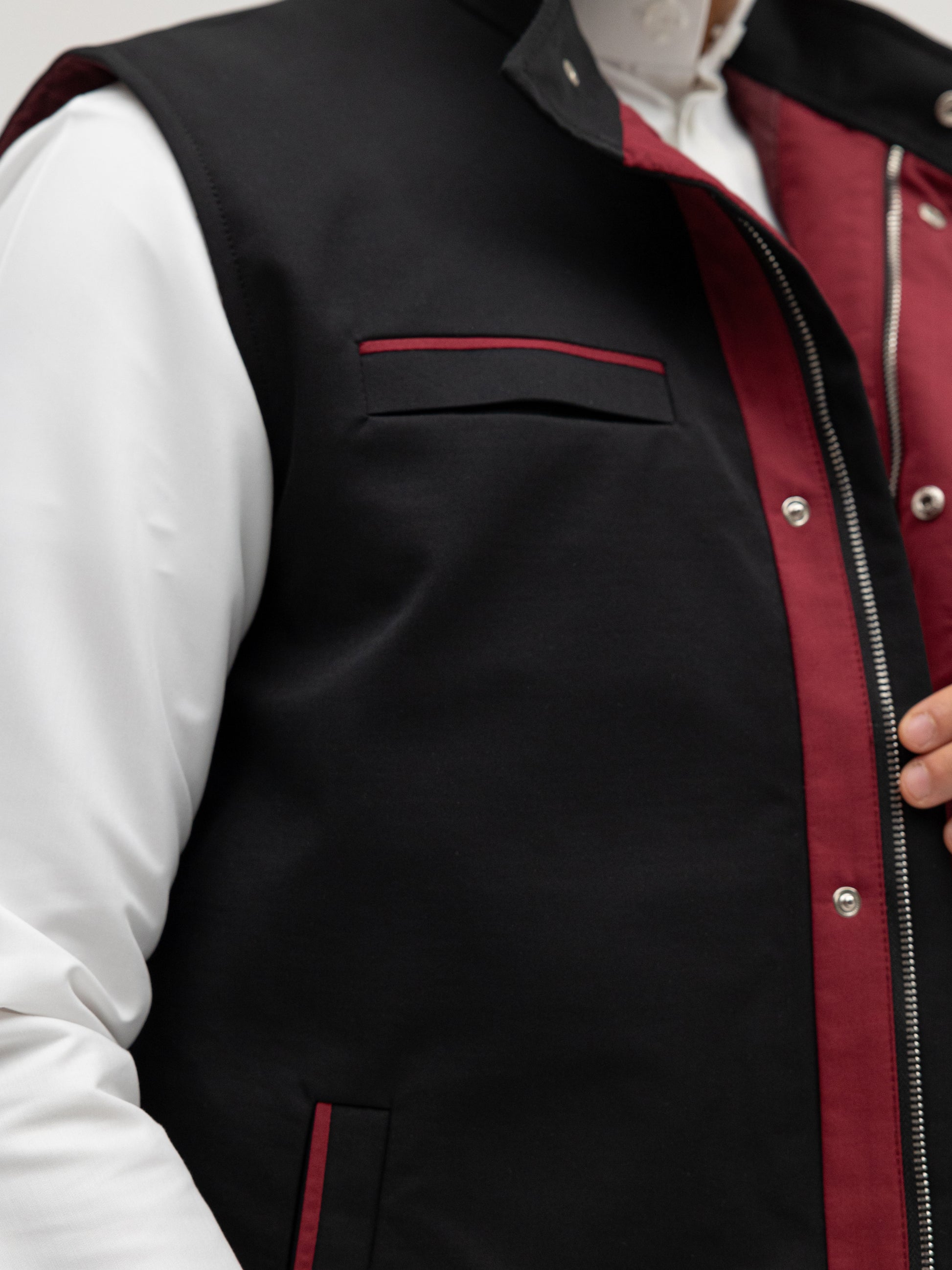 A sleek black vest with rich burgundy details that bring out a refined contrast. Perfect for elevating any winter outfit with a touch of bold sophistication.