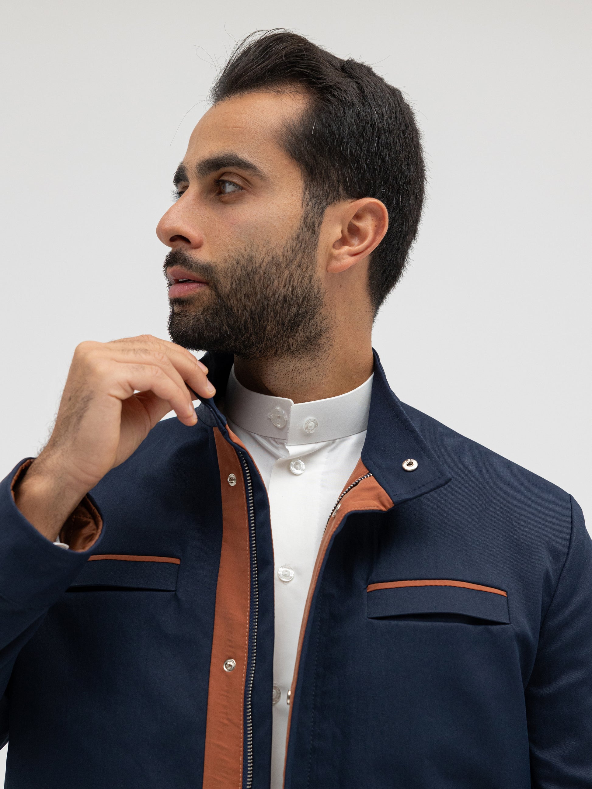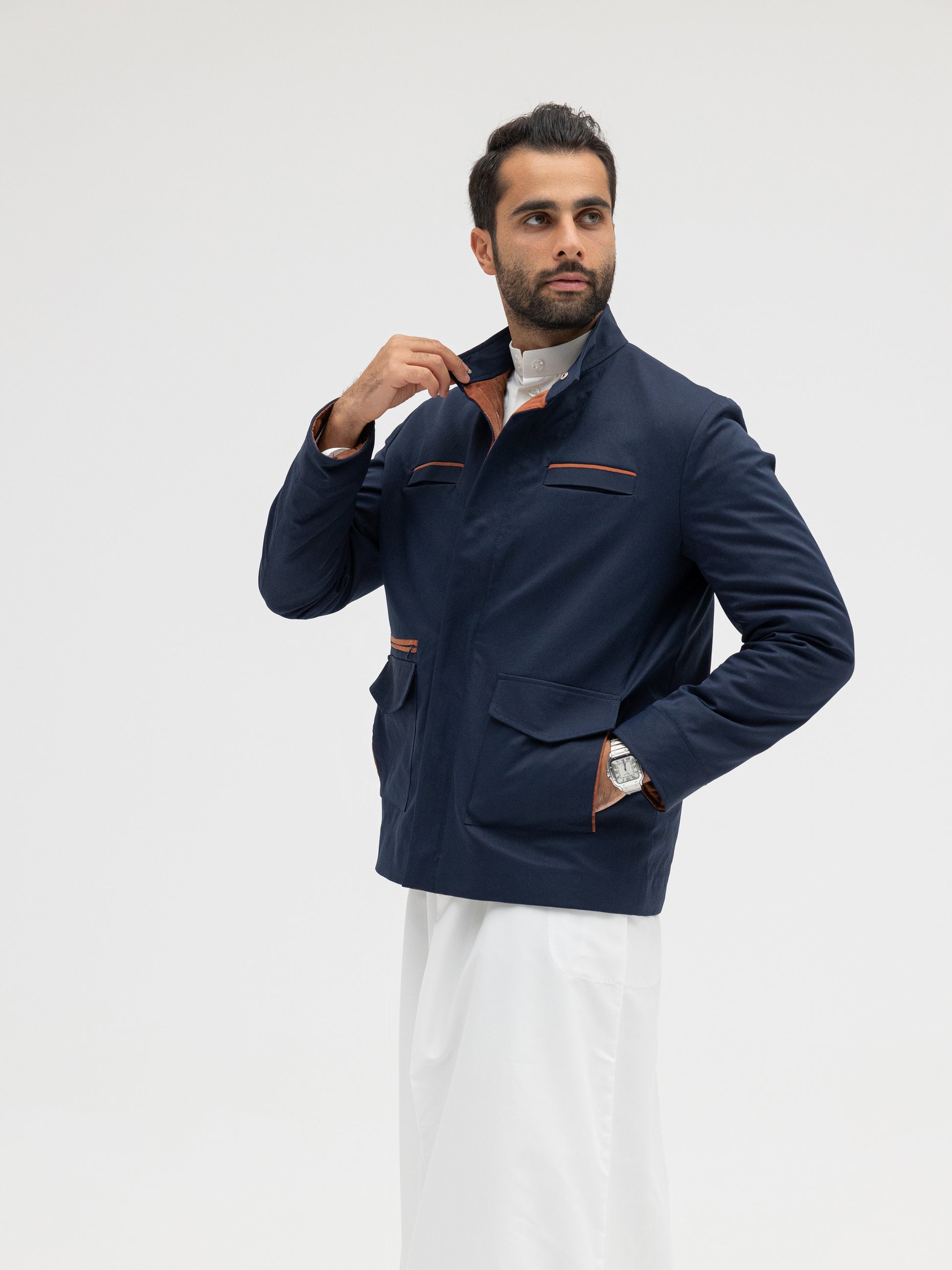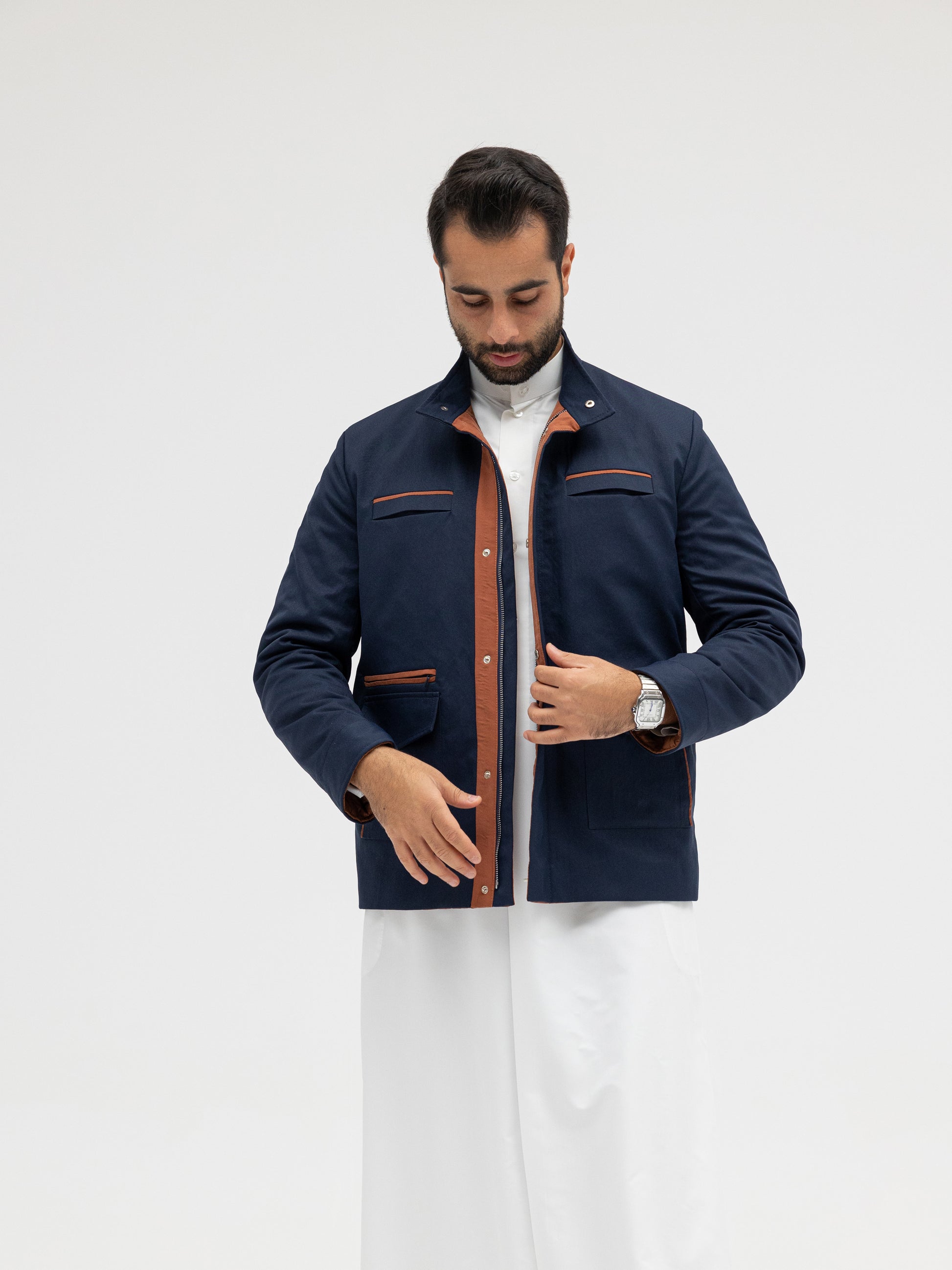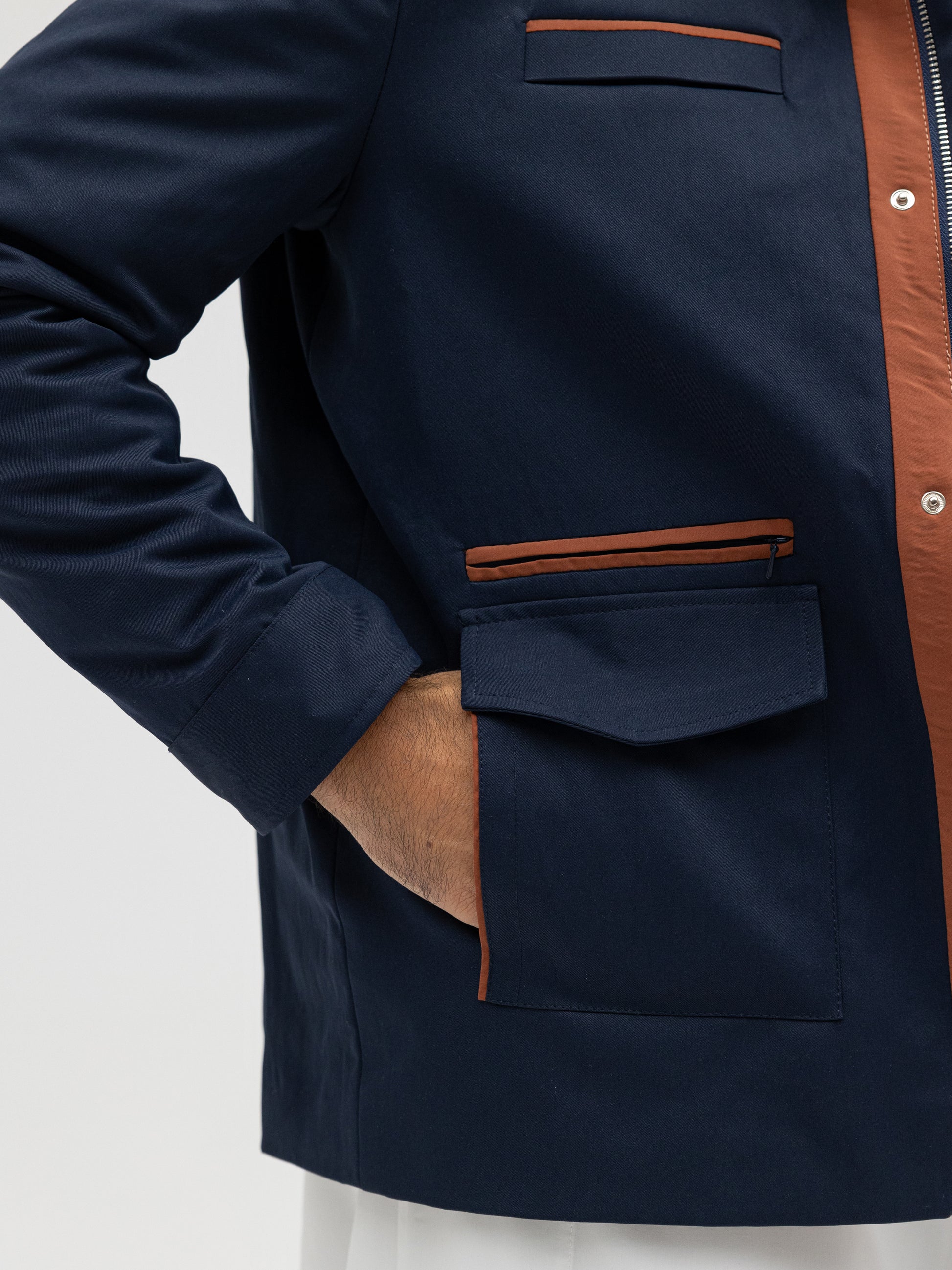 A sleek navy jacket elevated with copper-tone details that add a touch of sophistication. Designed with a structured fit for both formal and casual wear. Made from premium fabric that ensures durability and comfort.