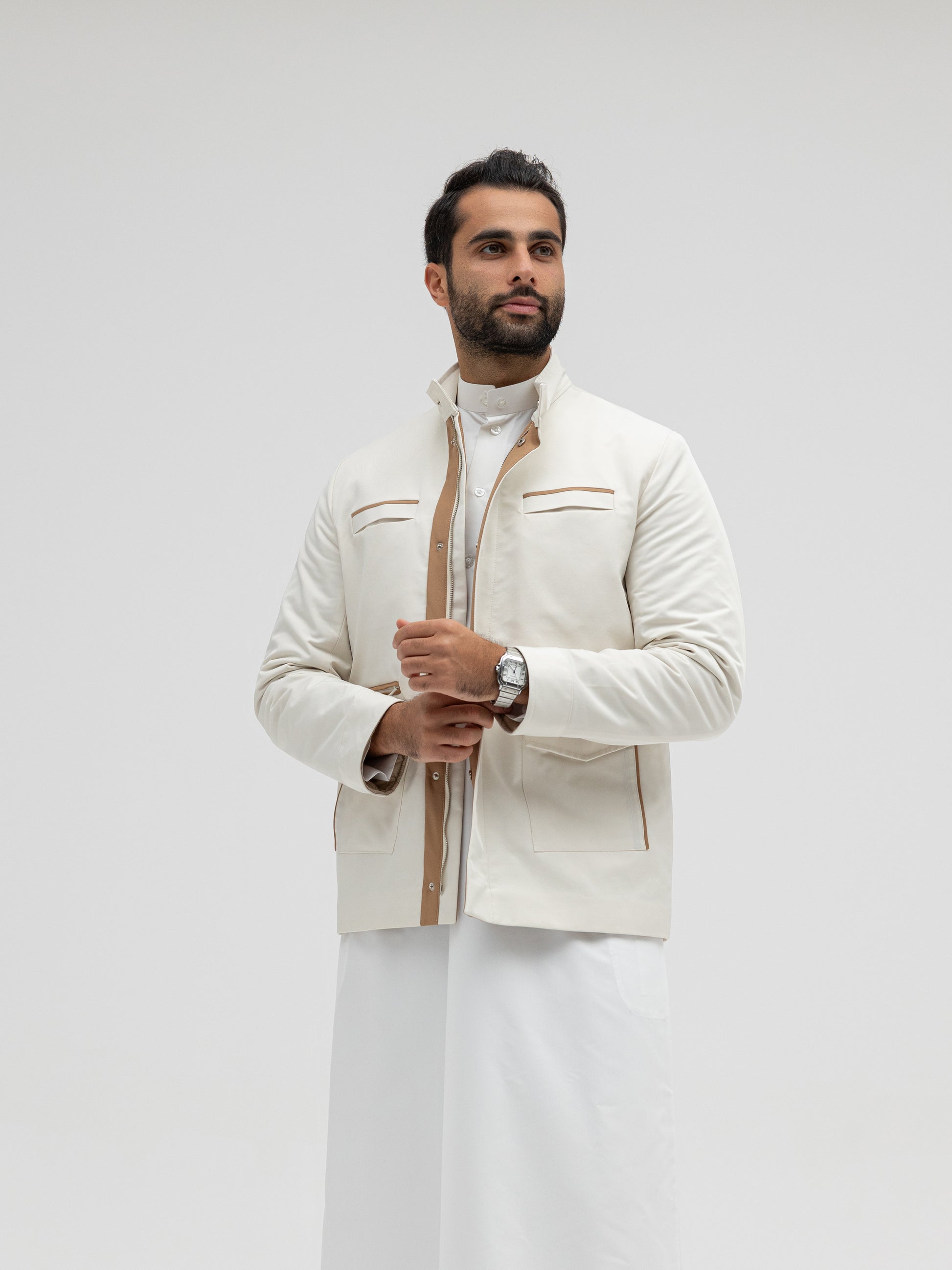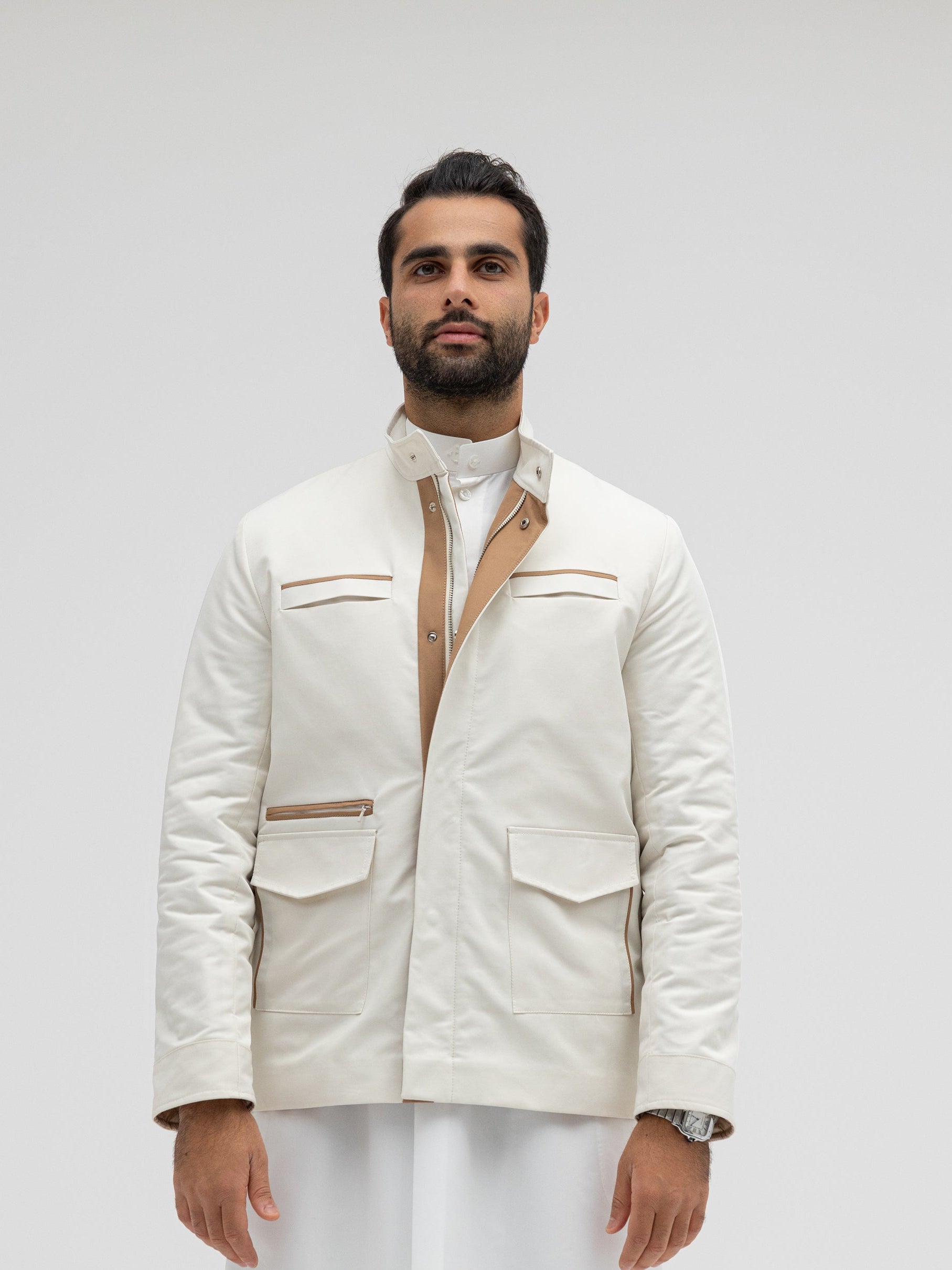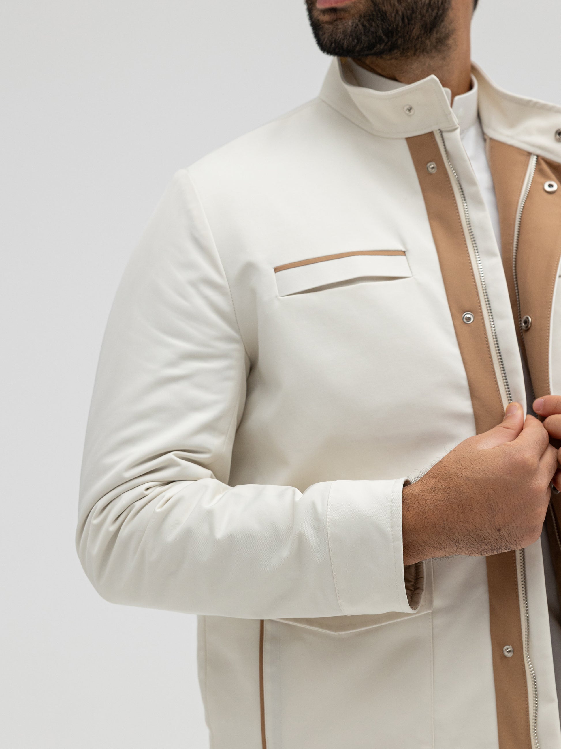 A refined off-white jacket featuring Camel accents on the pockets and zipper for a timeless contrast. Crafted from soft, durable fabric with light padding for warmth and comfort. Perfect for an elegant winter look